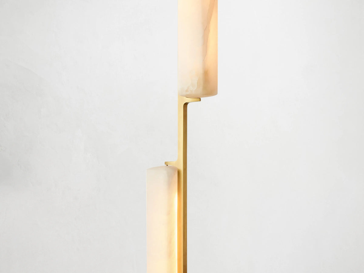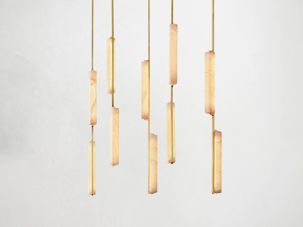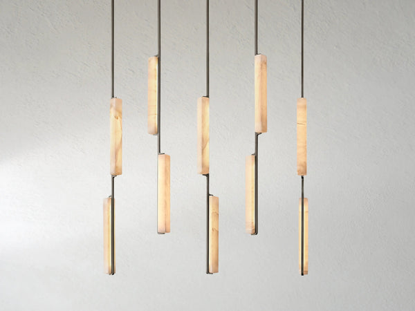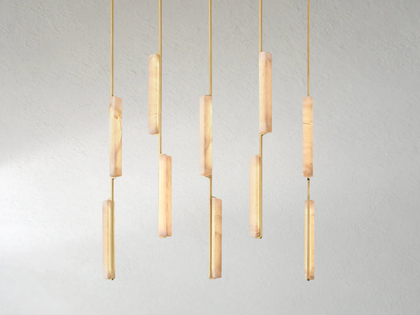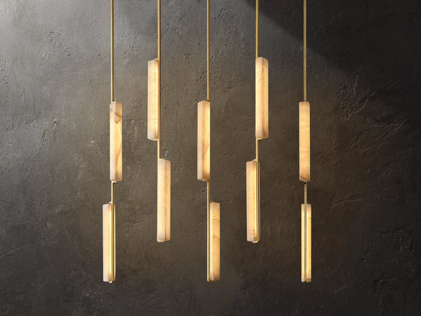 Sculptural and serene. The Ardubon Alabaster Linear Chandelier features ten elongated alabaster prisms suspended in perfect vertical rhythm along a linear brass frame. Each natural stone element softly diffuses the integrated LED light, casting a gentle, candle-like glow that brings warmth and balance to dining tables, kitchen islands, or long hallways. A modern statement piece with timeless materiality and quiet drama.